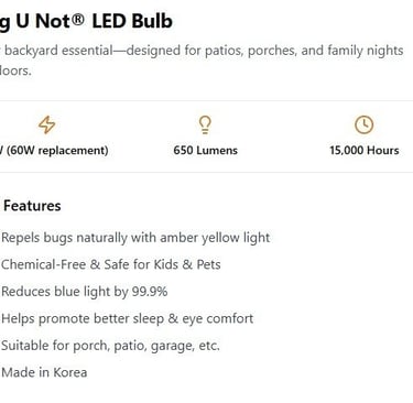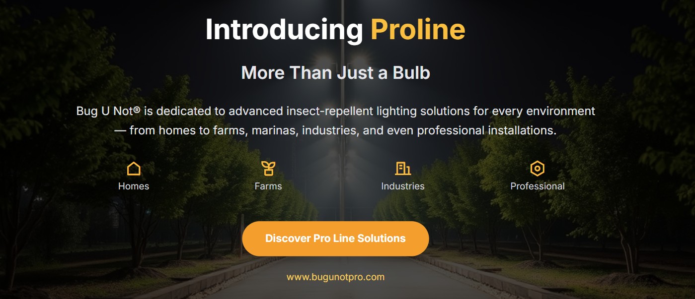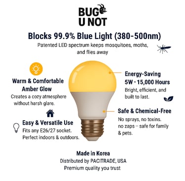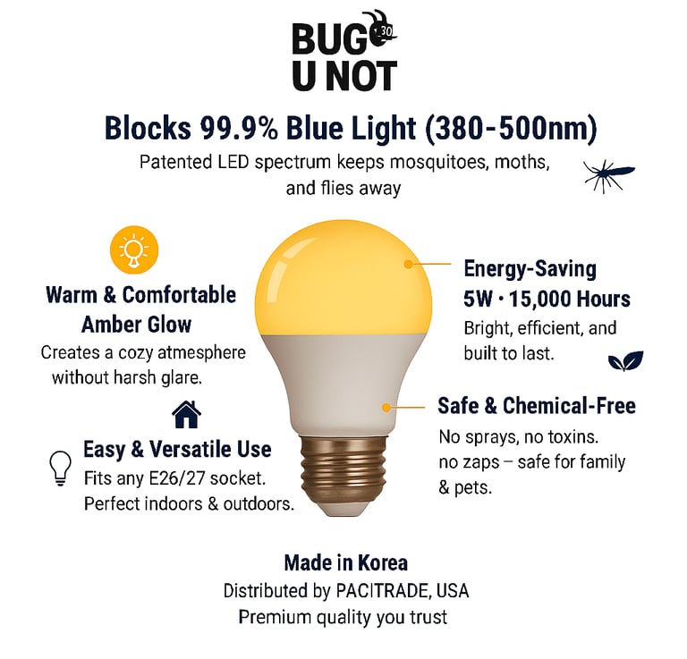 Bug U Not® exists to make outdoor and evening life comfortable and healthy. We engineer amber-spectrum, blue-light-blocked lighting that naturally repels insects—no chemicals, kid- and pet-safe, designed for better sleep and eye comfort.